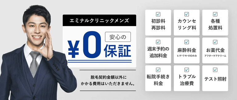 麻酔費用(医療ヒゲ・顔脱毛 選べる3部位3回プランは別途1回 2,000円)や中途解約料などの追加料金がかからないなど、患者にやさしい制度となっており、保証制度などのサポートも充実しているので、初めての脱毛の方でも安心して利用できるメンズ脱毛クリニックです。